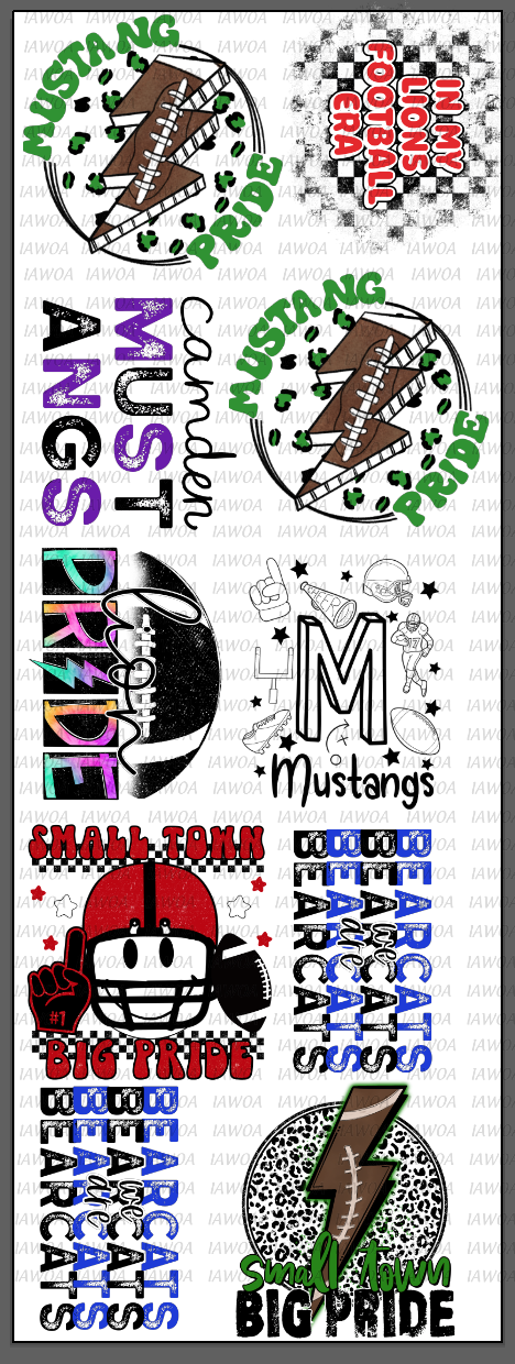 Choose up to 10 designs from our 20 different Team Spirit designs to create your own gang sheet! View them all here. Each design will be sized at 11"-12" on the longest side on a 22" by 60" gang sheet. This makes each design $2.98 each- if ordered individually they would be $4.25-$4.50 each!