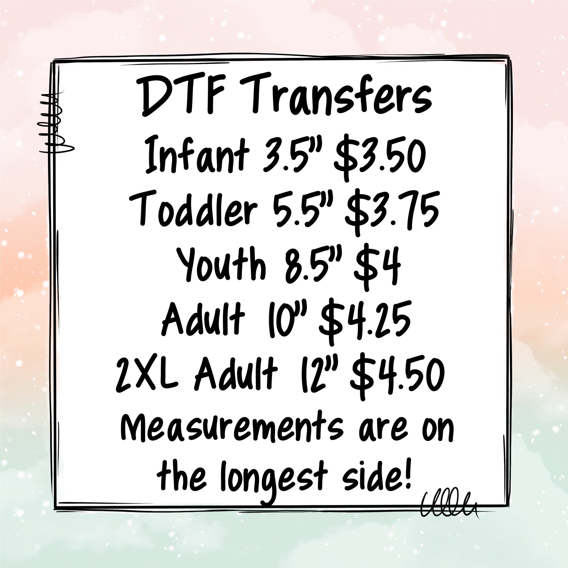 Measurements size is determined by the longest side of the transfer.