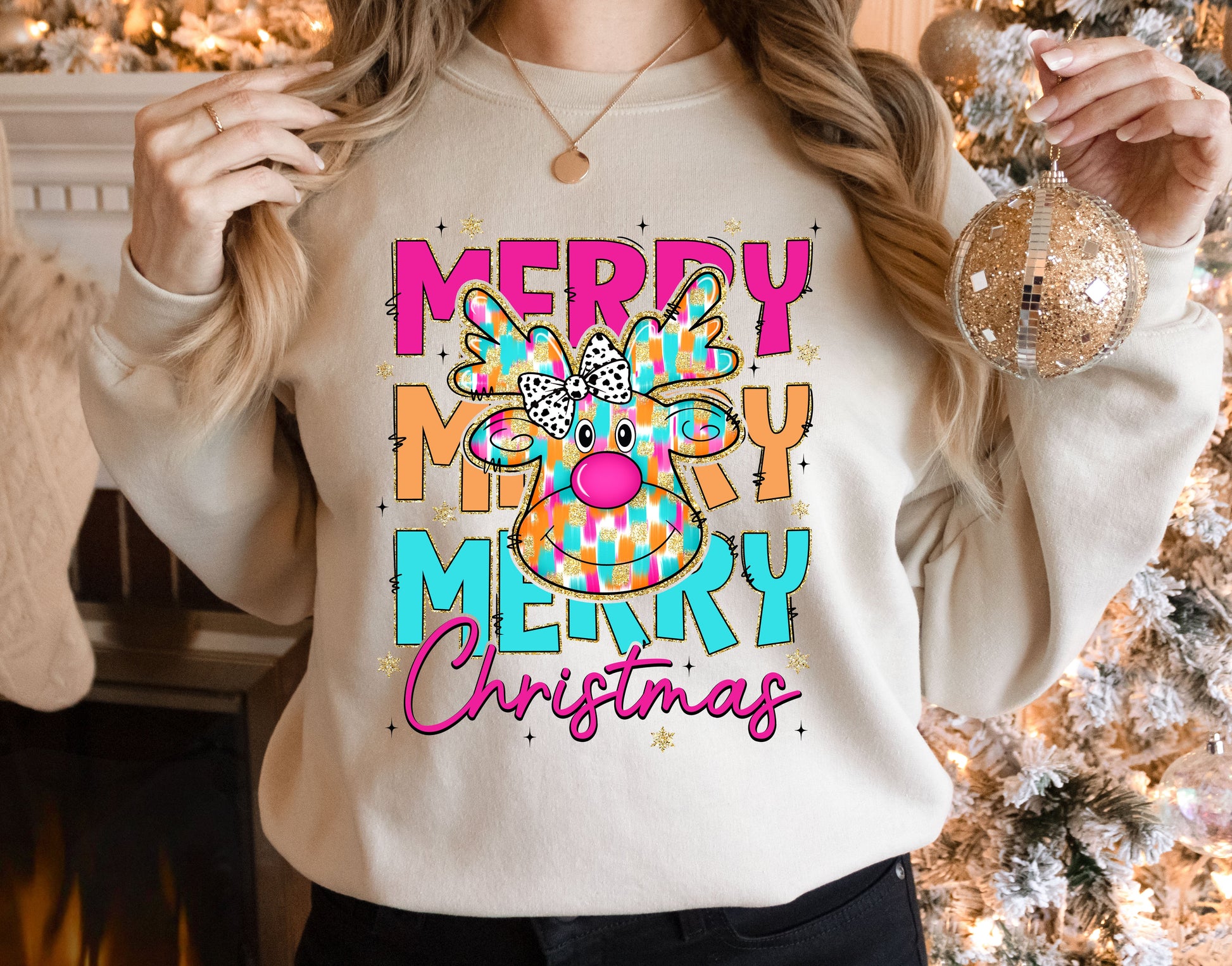 Glitter Pink Christmas Reindeer Adult Sweatshirt- Christmas 1567