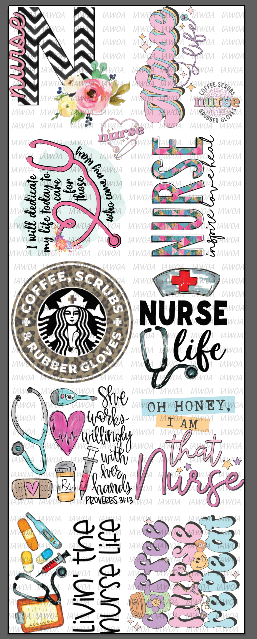This is a Nurse Themed 22"x 60" gang sheet with 10 Adult Transfers (12" on the longest side) and 2 pocket size transfers (4.5" on the longest side).