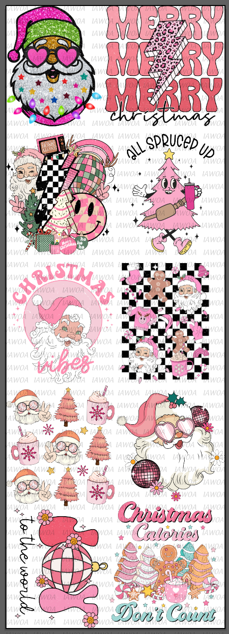This is a Pink Christmas Themed 22"x 60" gang sheet with 10 Adult Transfers (11"-12" on the longest side).