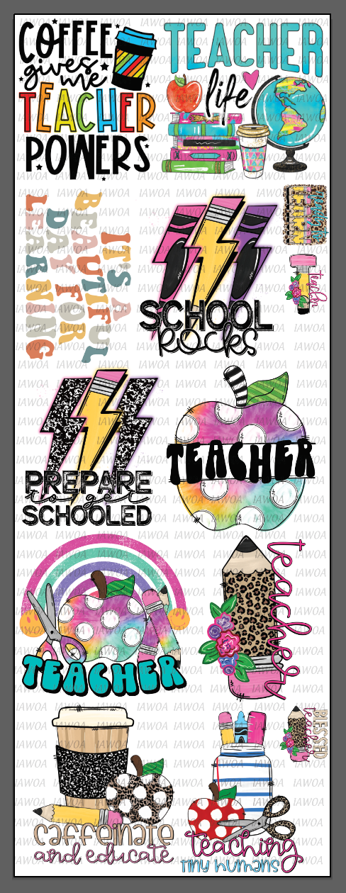 This is a Teacher Themed 22"x 60" gang sheet with 10 Adult Transfers (12" on the longest side) and 3 pocket size transfers (4.5" on the longest side).
